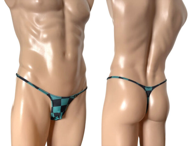 ボディウェアーのメンズTバック。2ウェイスパンデックスにチェック柄をプリント。サイドを極細に仕上げたシャープでスタイリッシュなハイレグビキニ。フロントハーフシーム。■サイズ:M(ウェスト76~84cm)■平置き寸法(フロント部分):股上11cm、横幅8cm■素材:ポリエステル80%、ポリウレタン20% ■生地の伸び:普通、厚さ:普通