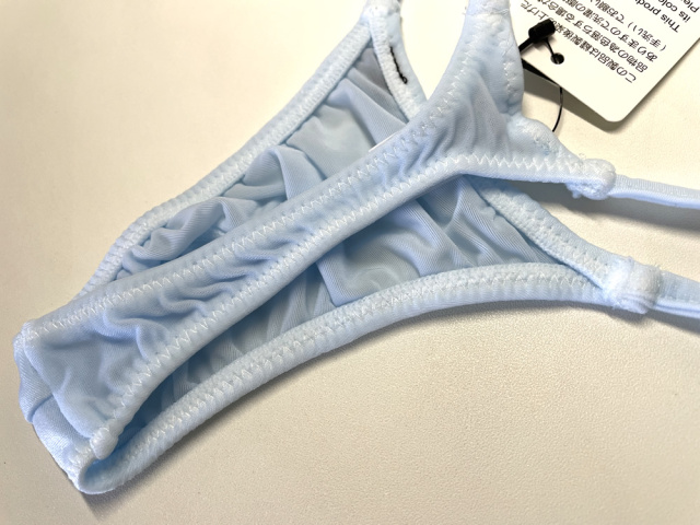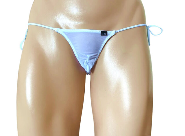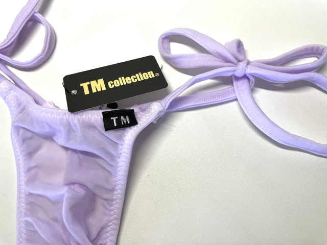 TMコレクションのメンズTバック。ツルツルモチモチな感触が人気のNewT2M2を使用。横ひも結びタイプの紐パンビキニです。シャープでセクシー&キュートなスタイル。フロントハーフシーム。 ■サイズ:M(ウェスト76~84cm) ■平置き寸法:股上12cm、フロント部分幅8cm ■素材:ナイロン72% ポリウレタン28% ■生地の伸び:非常に伸びる、厚さ:非常に薄い