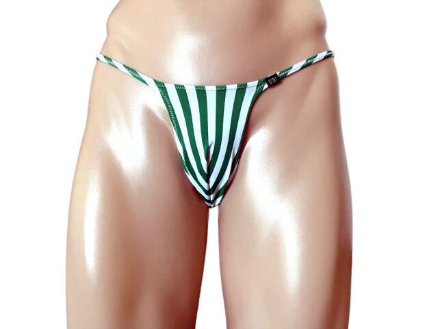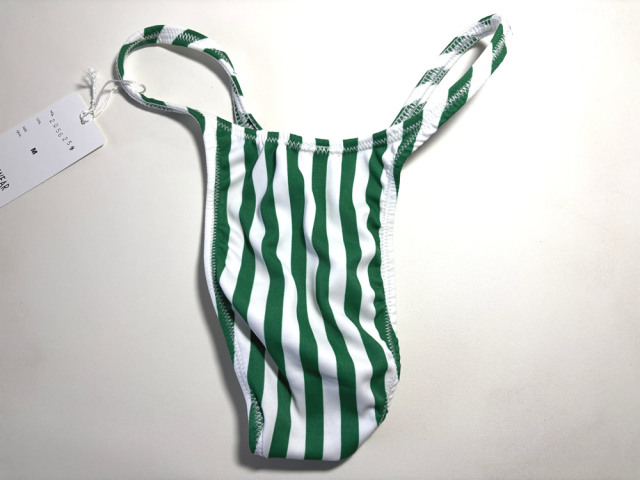 ボディウェアーのメンズTバック。グリーンのストライプをプリントした2ウェイストレッチビキニ。サイドを極細に仕上げたシャープでスタイリッシュなハイレグビキニ。フロントハーフシーム。■サイズ:M(ウェスト76~84cm)■平置き寸法(フロント部分):股上11cm、横幅8cm■素材:ポリエステル80%、ポリウレタン20% ■生地の伸び:普通、厚さ:普通