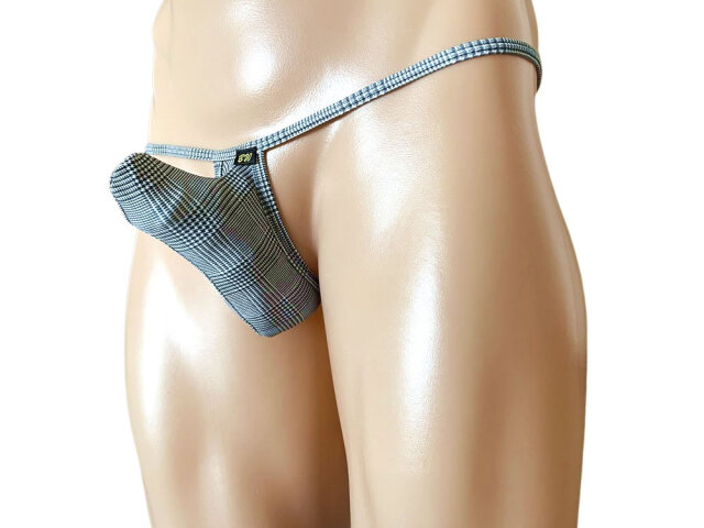 ボディウェアーのメンズGストリング。ギンガムチェック柄の2ウェイ生地を使用。フロントはピストルのような形で上部に突出させたTフロントデザイン。フルシームでギリギリの履き心地ながらも収まり感良好。■サイズ:M(ウェスト76~84cm)■平置き寸法(フロント部分):股上16cm、横幅9cm■素材:ポリエステル80%、ポリウレタン20% ■生地の伸び:普通、厚さ:普通