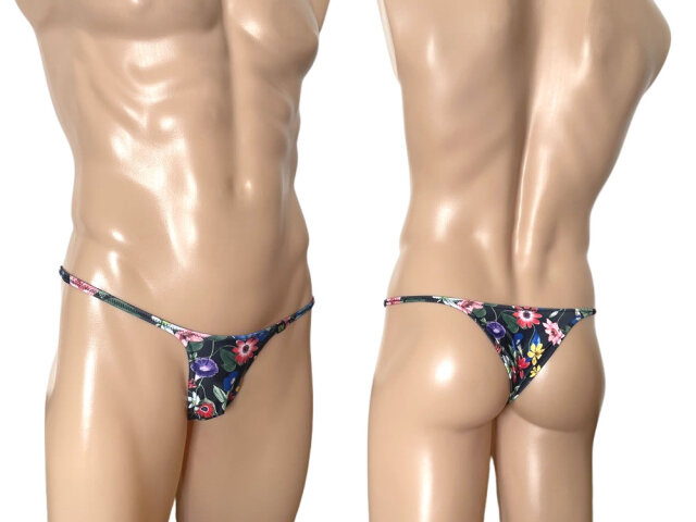 ボディウェアーのメンズリオバック。ブラックフラワー柄をプリントした2ウェイ素材。サイドを極細に仕上げたシャープでスタイリッシュなハイレグビキニ。フロントハーフシーム。M、Lサイズあり。 ■サイズ:M(ウェスト76~84cm)、L(ウェスト84~94cm) ■平置き寸法(フロント部分):Mサイズ股上11cm、横幅8cm、Lサイズ股上12cm、横幅9cm■素材:ポリエステル80%、ポリウレタン20% ■生地の伸び:普通、厚さ:普通